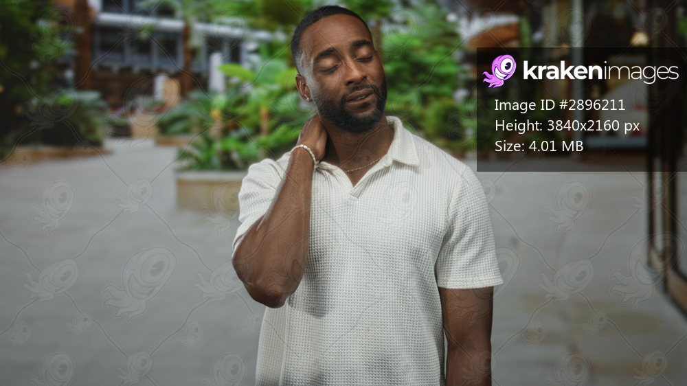 Man in white polo with hand on neck standing on urban street beside planters and storefronts; discomfort fatigue.