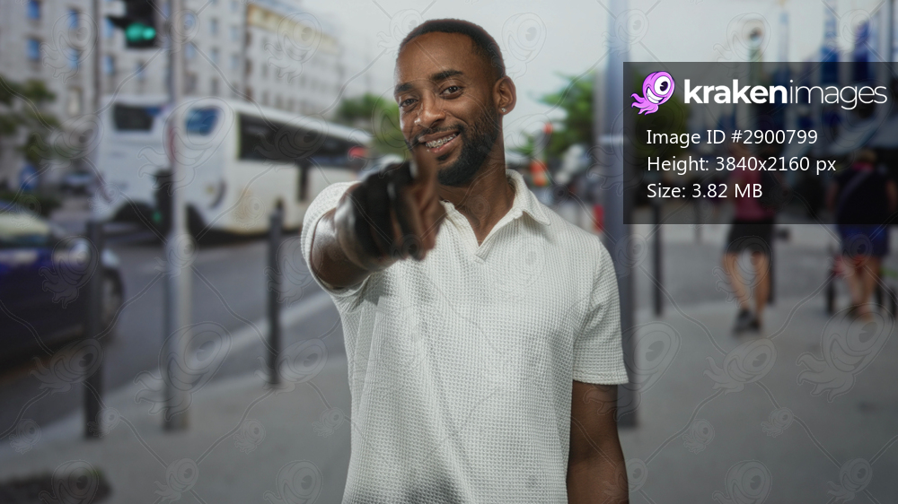 Man in white polo points finger to camera on a busy city street near buses and pedestrians; confidence invitation connection.