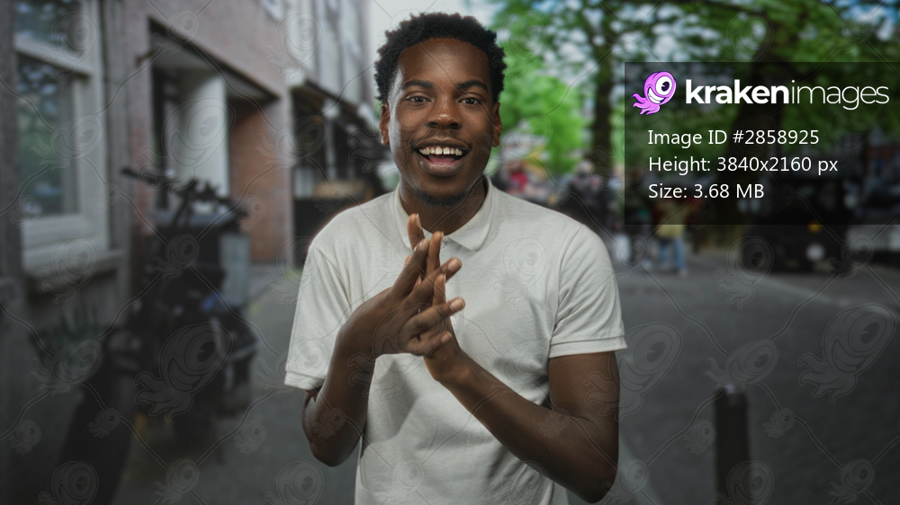 Man in white polo shirt claps hands and smiles broadly on street lined with buildings; anticipation eagerness.