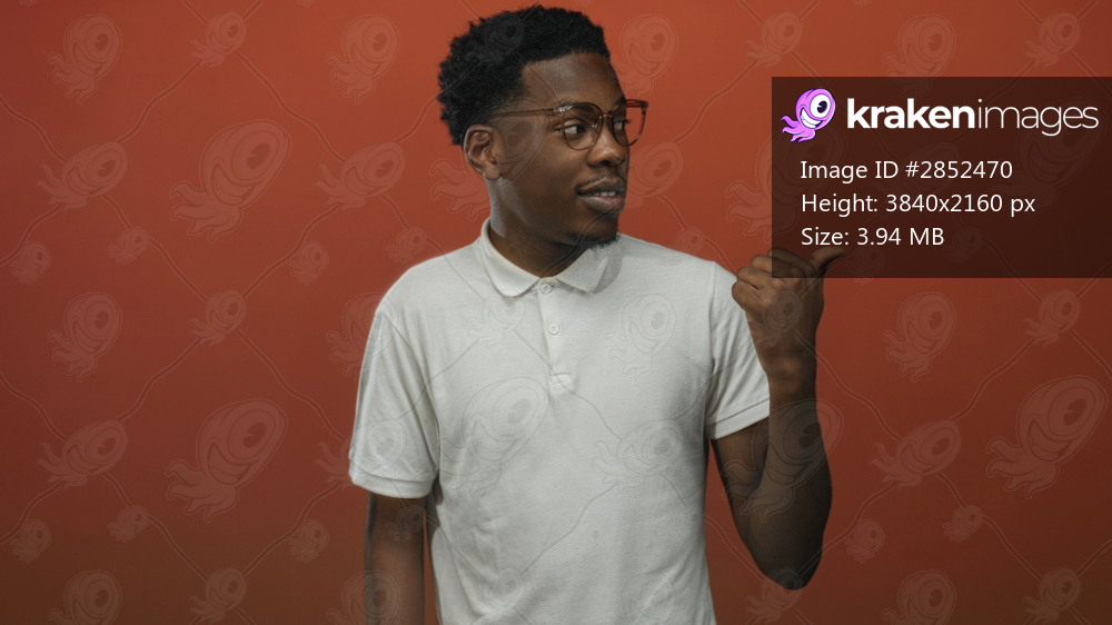 Man in white polo shirt and eyeglasses points thumb over shoulder with inquisitive expression in orange studio setting; confidence.