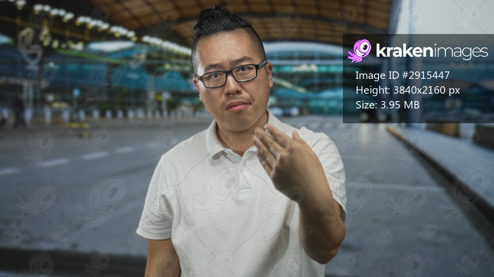 Man in white polo shirt and glasses points finger toward camera at busy airport terminal showing palm forward and stern expression; direct accusation frustration. - Kraken Images