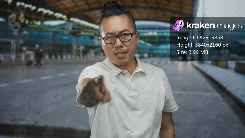 Man in white polo shirt and glasses points finger toward camera at busy airport terminal showing palm forward and stern expression; direct accusation frustration. - Kraken Images