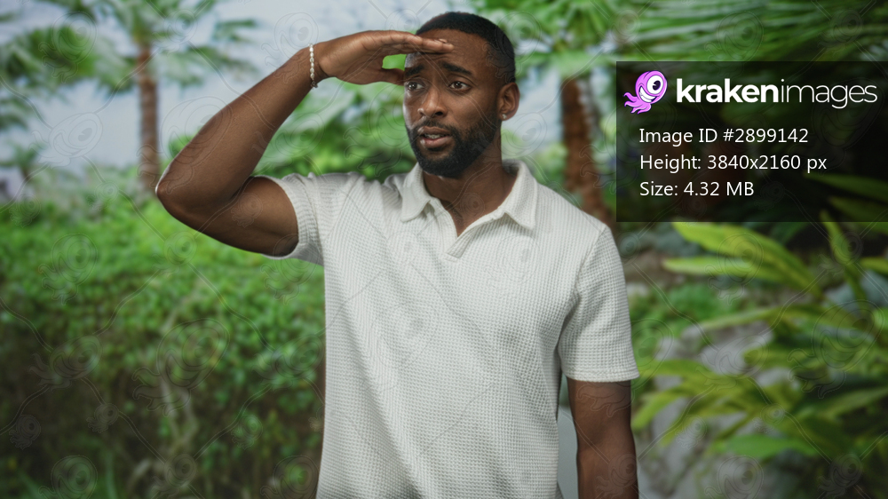 Man in white polo shirt with hand to forehead looking toward treeline in forest; hope curiosity discovery.