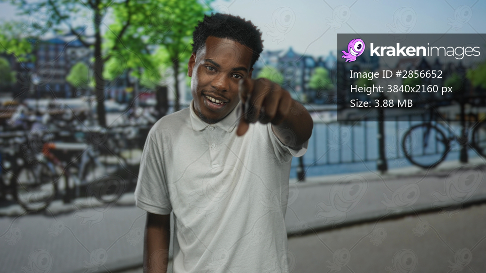 Man in white polo shirt points finger on street next to canal railing and parked bicycles; connection confidence.