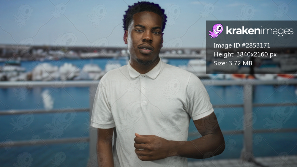 Man in white polo shirt touches shoulder by boats at seaside railing on street; serenity contemplation.