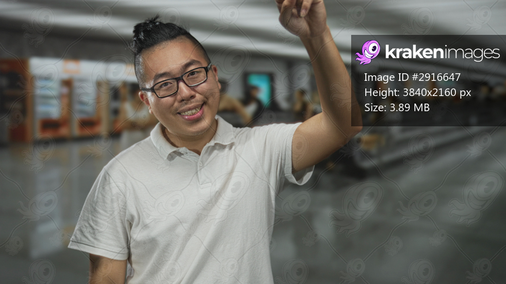 Man in white polo smiling with finger to forehead gesture at airport terminal indoors; friendly travel.