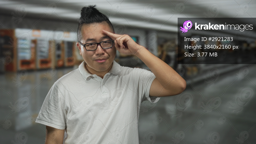 Man in white polo smiling with finger to forehead gesture at airport terminal indoors; friendly travel.