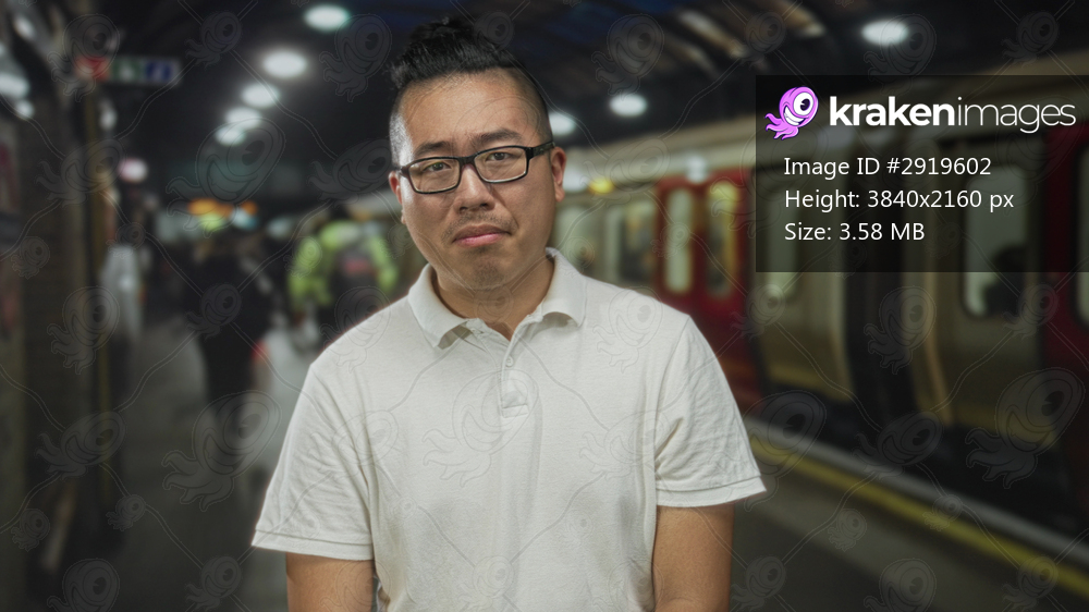 Man in white polo standing on a train platform inside a building, wearing glasses and smiling slightly with subway car behind; urban commute uncertainty. - Kraken Images