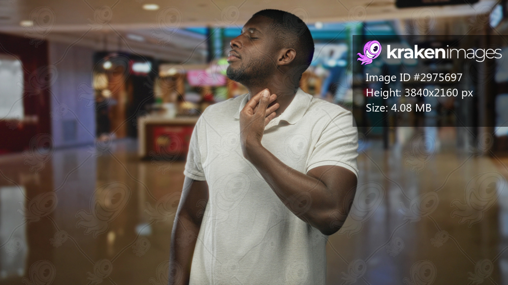 Man in white polo touching jaw with right hand and looking sideways in an airport concourse near shops and kiosks; pensive reflection.