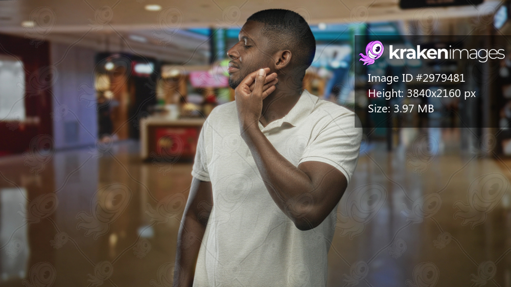 Man in white polo touching jaw with right hand and looking sideways in an airport concourse near shops and kiosks; pensive reflection.