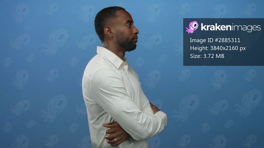 Man in white shirt with arms crossed and hands visible in a blue studio side profile, young african american with neutral expression; contemplation.