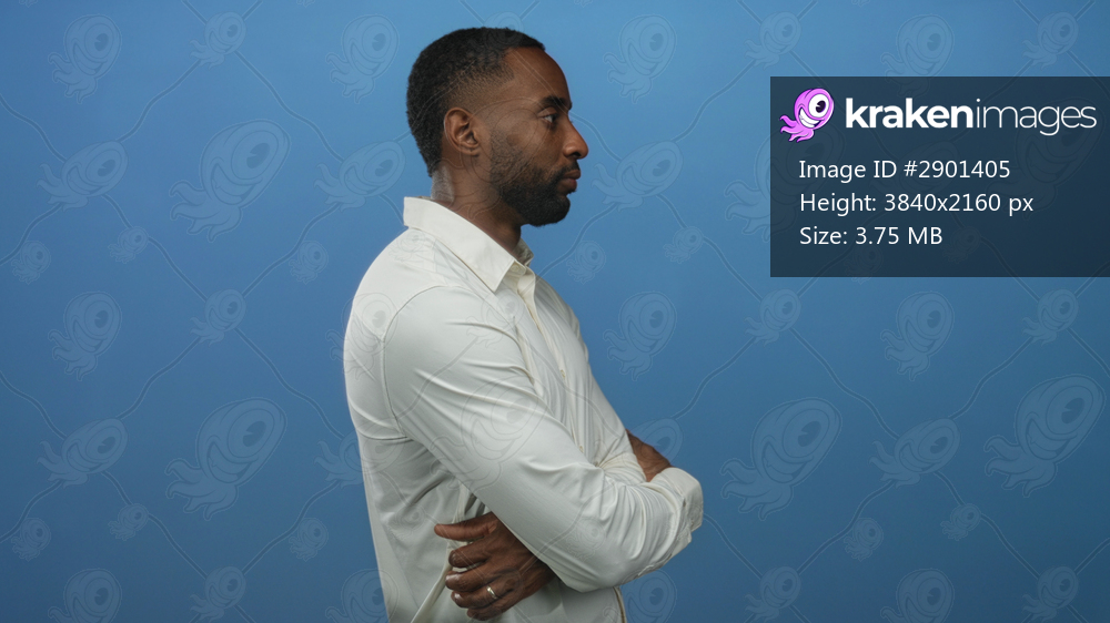Man in white shirt with arms crossed and hands visible in a blue studio side profile, young african american with neutral expression; contemplation.