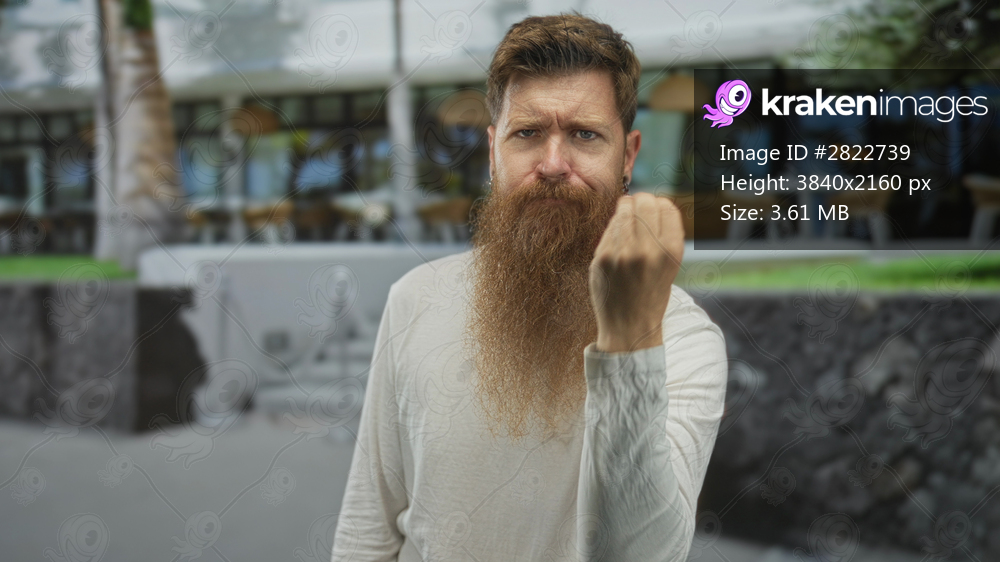 Man in white shirt with beard clenching fist on a restaurant terrace outdoors; defiance strength determination resolve.