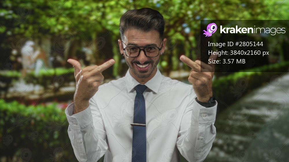 Man in white shirt and blue tie flips middle finger gesture on a forest path lined with green hedges; bold defiance.