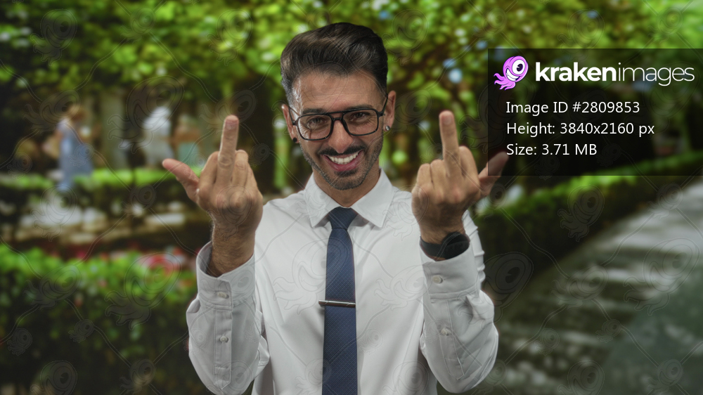 Man in white shirt and blue tie flips middle finger gesture on a forest path lined with green hedges; bold defiance.