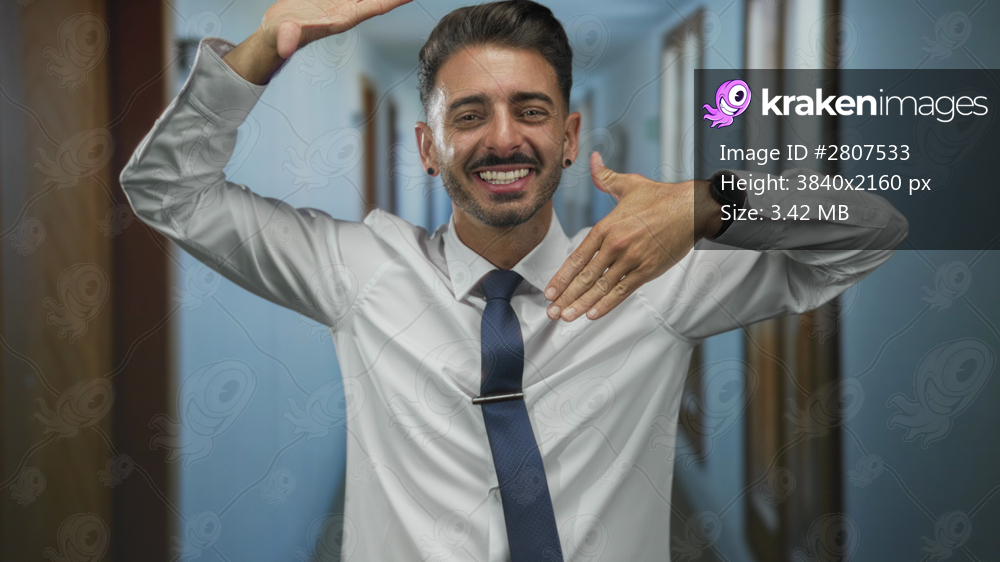 Man in white shirt and blue tie framing with hands in hotel corridor; creative vision confidence boldness.