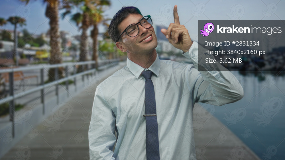 Man in white shirt and blue tie pointing finger at boats on port dock lined with palm trees; highlight confidence.