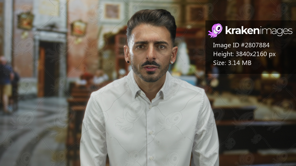 Man in white shirt gazes forward with uncovered face and trimmed beard inside church building adorned with wooden pews; serenity.