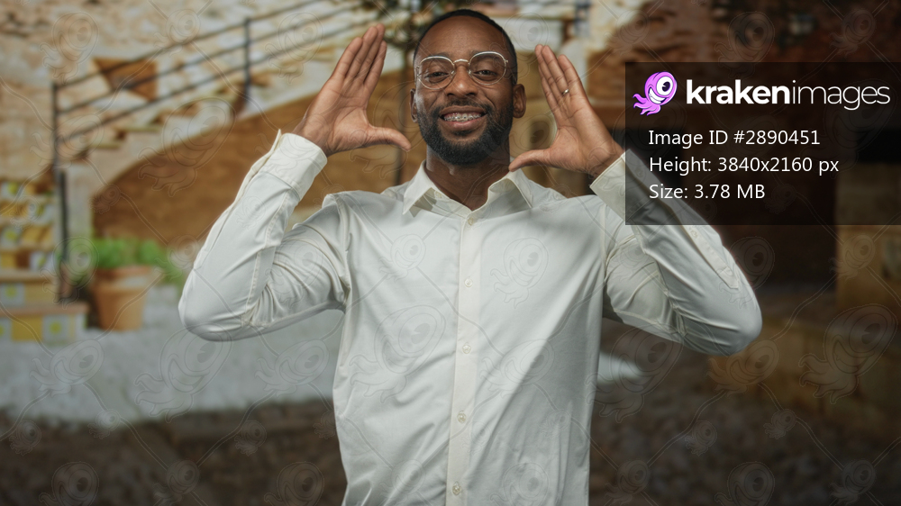 Man in white shirt and glasses framing head with both hands on a sunny old town street near stone archway; confidence.