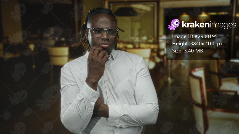 Man in white shirt and glasses with hand on chin standing in a restaurant building dining area; thoughtful concern.