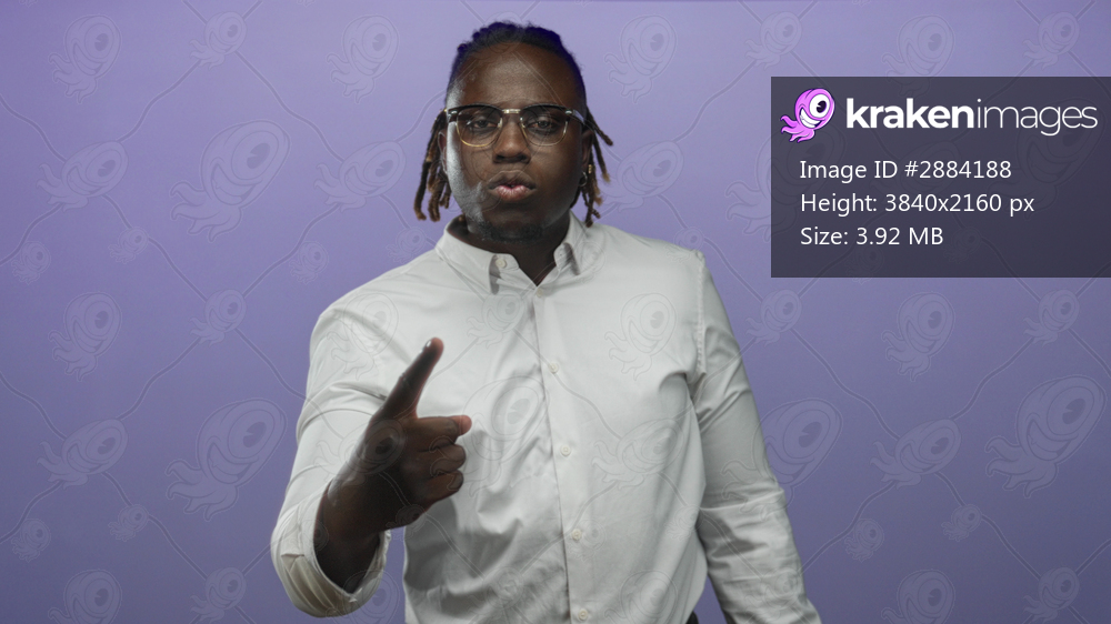 Man in white shirt and glasses points with outstretched hand toward camera while smiling and forming fists in a purple studio; confidence ambition positivity. - Kraken Images