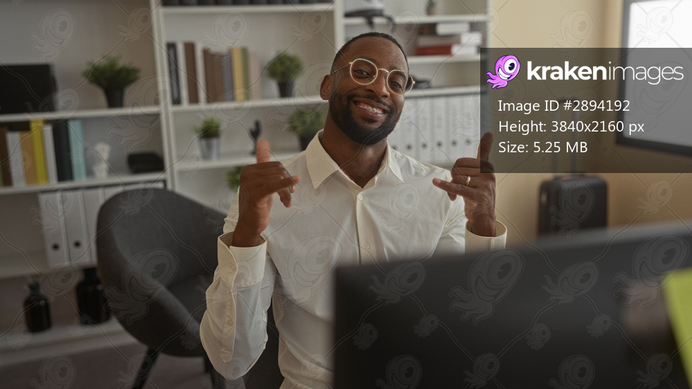 Man in white shirt and glasses smiling and showing thumbs up with both hands at desk in office with bookshelf and suitcase; confidence positivity.