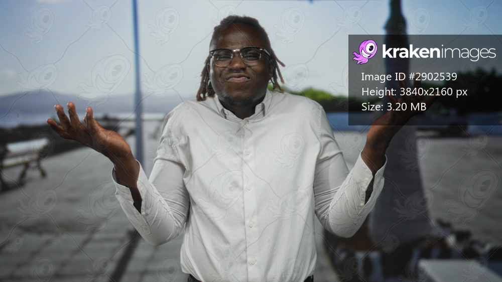 Man in white shirt and glasses touching his head and shrugging hands on a seaside street pier while squinting and pursing lips; confusion.