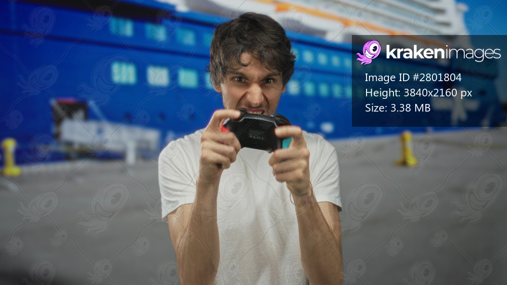 Man in white shirt grips game controller with grimace at building entrance by cruise ship; frustration.
