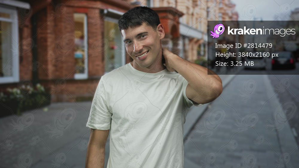 Man in white shirt with hand on neck smiles while standing on busy city street in front of brick building; happiness.