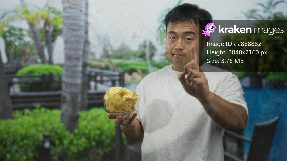 Man in white shirt holding a bowl of potato chips and pointing finger beside a building pool at a resort; craving.