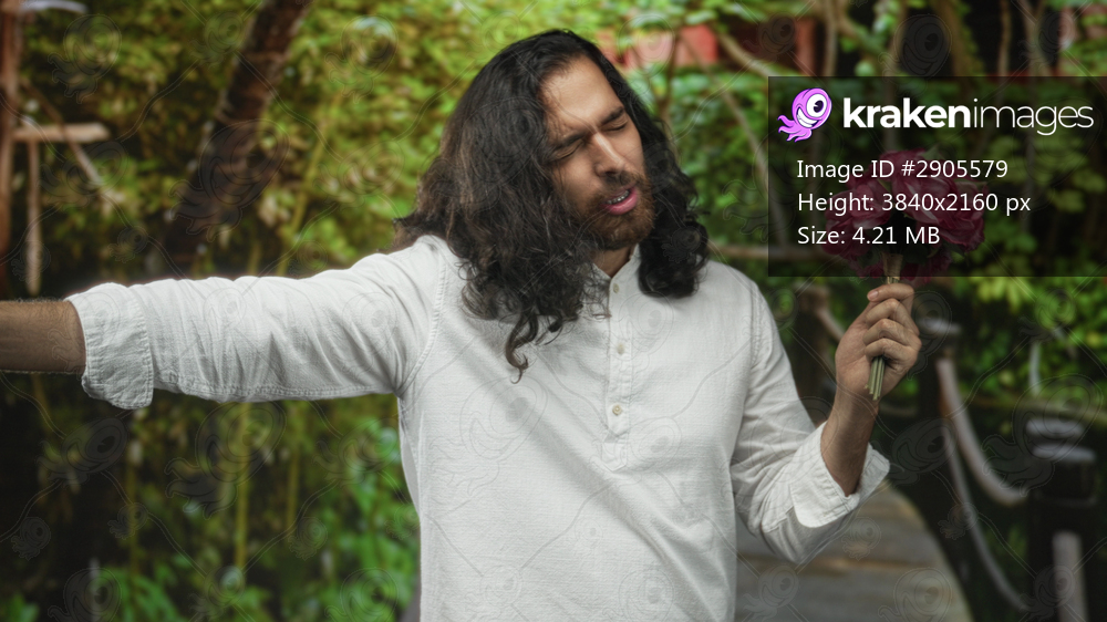Man in white shirt holding bouquet and points finger on forest path near wooden bridge; romance apology.