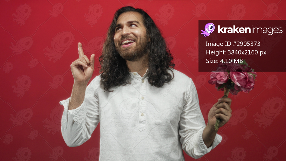 Man in white shirt holding pink bouquet and pointing index finger in red studio; romance optimism joy.