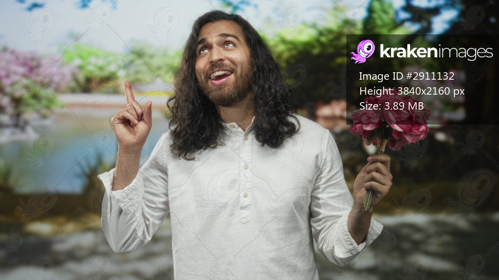 Man in white shirt holding pink bouquet and smiling with braces while pointing finger to sky in forest; romance hope greeting.