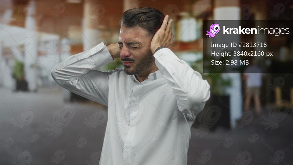Man in white shirt holds hands over ears in building foyer under natural light as he winces from loud noise; annoyance.