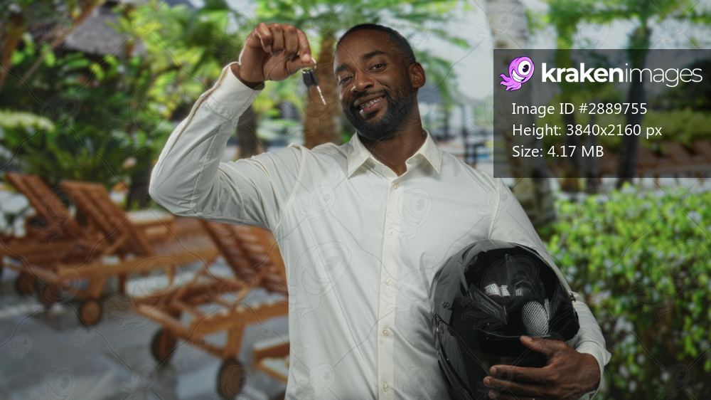 Man in white shirt holds keys up with hand and cradles motorcycle helmet in park with lounge chairs and palm trees; pride ownership success.