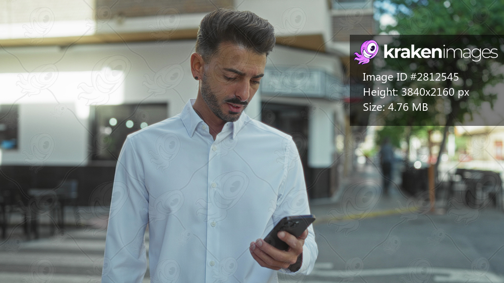 Man in white shirt holds smartphone in hand on busy city street, glancing at screen; digital connection focus.