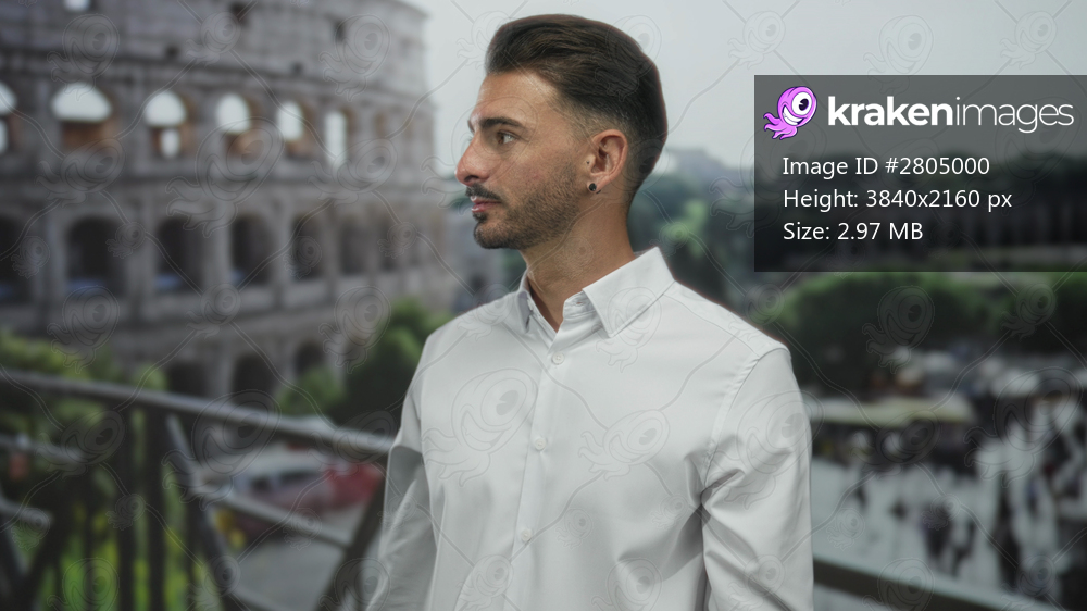 Man in white shirt looking down at coliseum building outdoors under soft sunlight; serenity introspection.