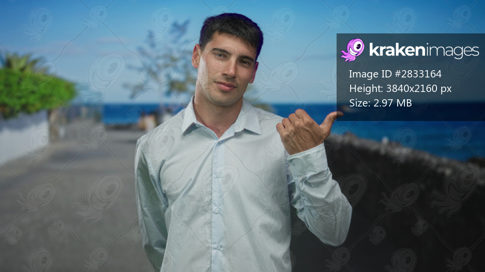 Man in white shirt makes shaka gesture on street by the seaside promenade, smiling towards camera; friendly greeting.