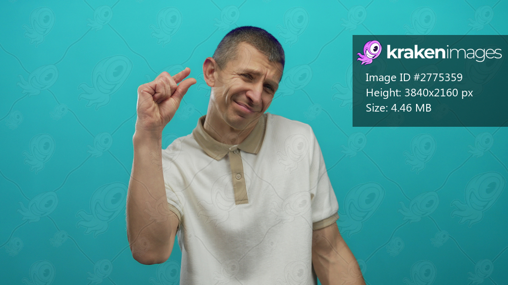 Man in white shirt makes small gesture with fingers against isolated blue wall expressing small size or minimal concept.