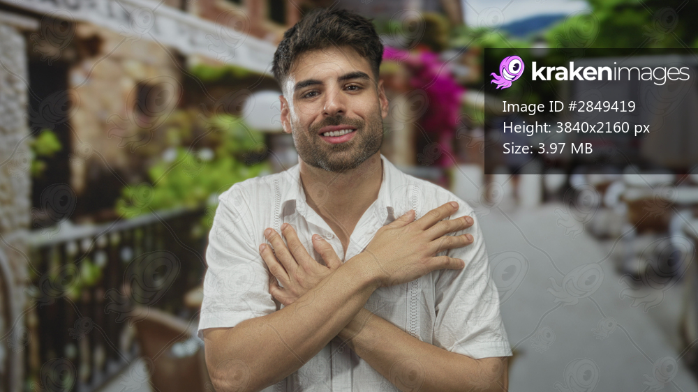 Man in white shirt places hand on chest on vibrant city street with blurred cafe terraces and green foliage visible; gratitude.
