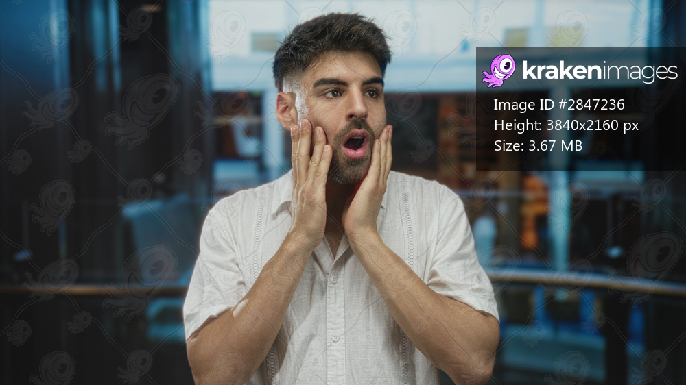 Man in white shirt places hands on cheeks with open mouth inside brightly lit hotel building interior; surprise.