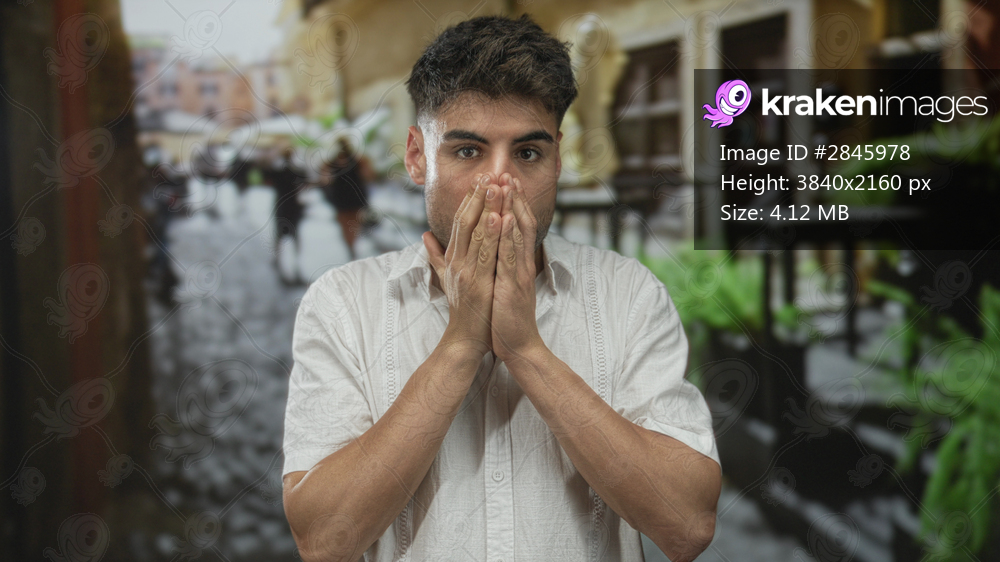 Man in white shirt points finger then covers mouth on street with blurred pedestrians and building facades; surprise.