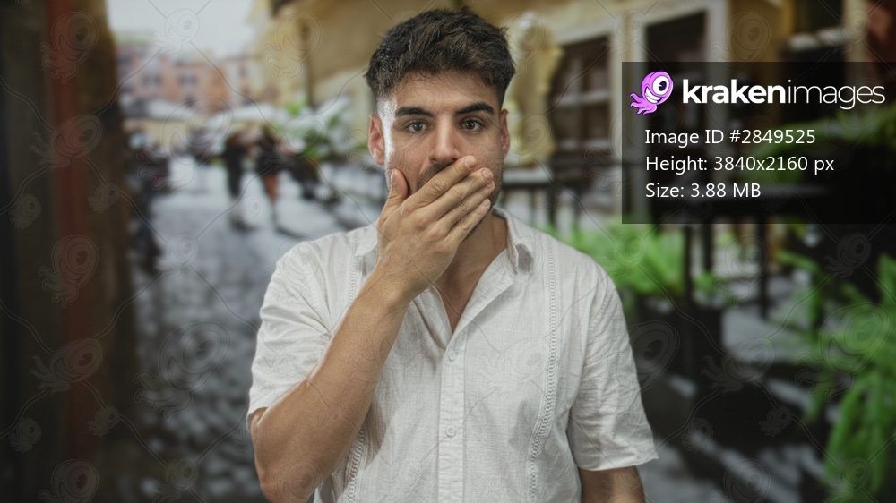 Man in white shirt points finger then covers mouth on street with blurred pedestrians and building facades; surprise.