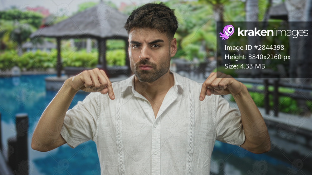 Man in white shirt points thumbs down at chest in building by poolside seating area; disapproval self doubt.
