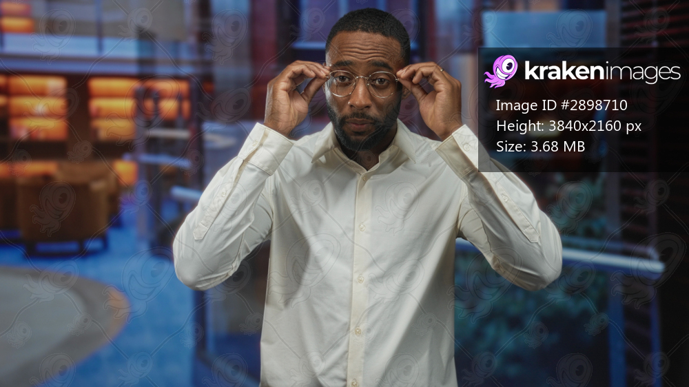 Man in white shirt puts on round eyeglasses with hands at face inside a modern hotel building lobby, looking toward camera; thoughtful focus.