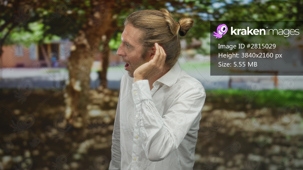 Man in white shirt with raised hand, long hair and thoughtful gaze in green park under sunlight; curiosity.