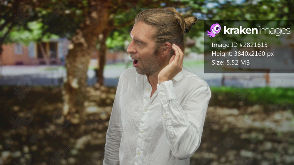 Man in white shirt with raised hand, long hair and thoughtful gaze in green park under sunlight; curiosity.