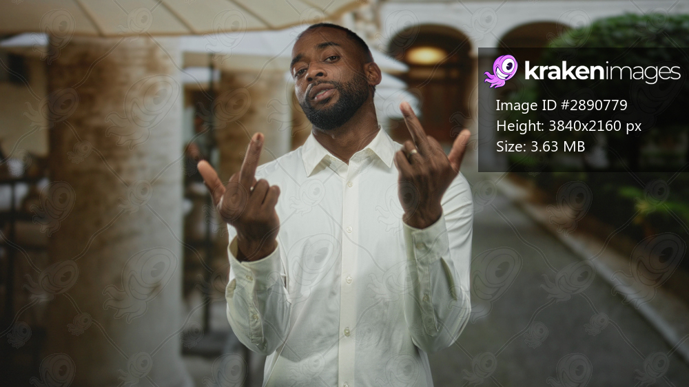 Man in white shirt raises both middle fingers toward camera while standing on outdoor building terrace; defiance.