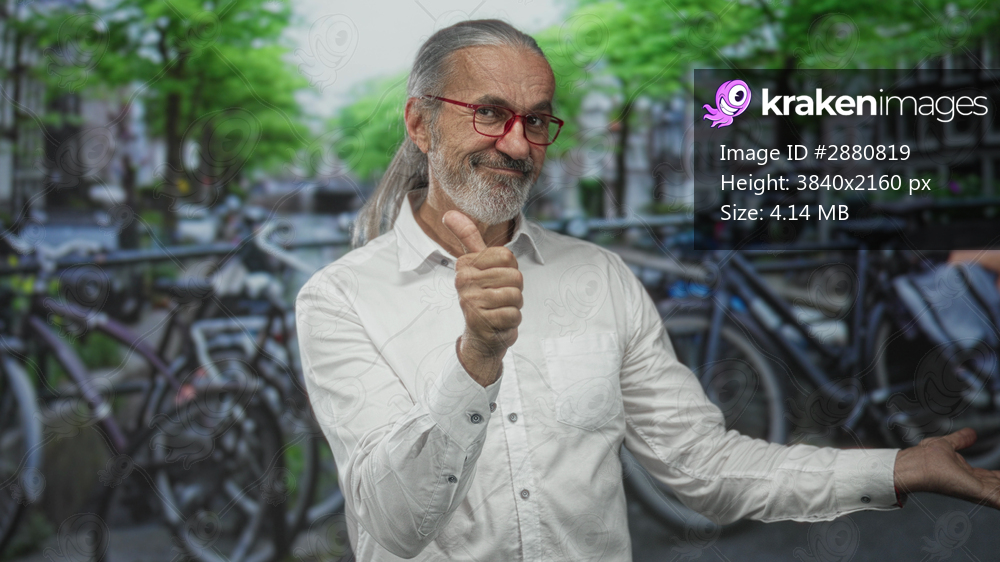Man in white shirt with red glasses and long grey hair gesturing to parked bicycle at a street bike parking rack, smiling; community sharing welcoming. - Kraken Images