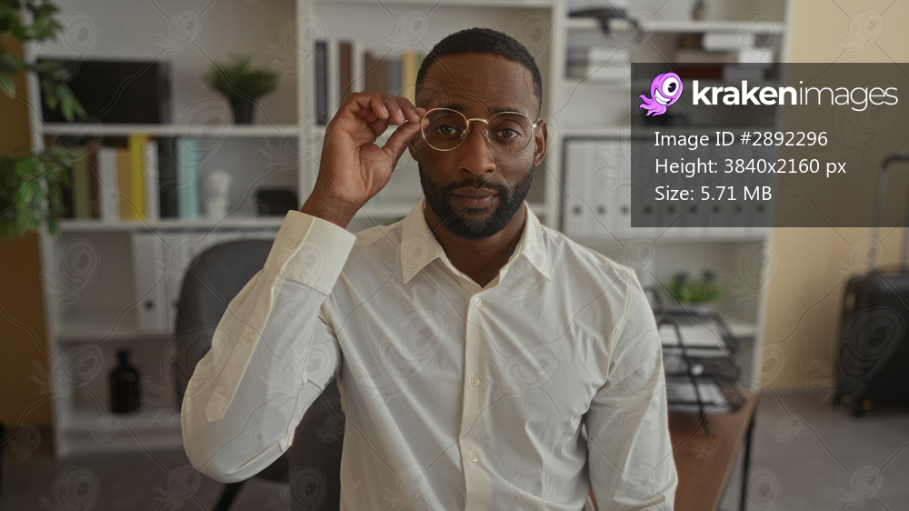 Man in white shirt seated at desk in office adjusting his glasses and later crossing his arms while looking at camera; thoughtful focus.